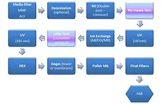 UPW and the commonly used term deionized (DI) water are not the same. In addition to the fact that UPW has organic particles and dissolved gases removed, a typical UPW system has three stages: a pretreatment stage to produce purified water, a primary stage to further purify the water, and a polishing stage, the most expensive part of the treatment process.[upper-alpha 1]