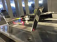 The Ultrasonic Consolidation or Ultrasonic Additive Manufacturing process was invented and patented by Dawn White.[10] In 1999, White founded Solidica Inc. to sell commercial UAM equipment—Form-ation machine suite. Near 2007, the Edison Welding Institute (EWI) and Solidica began a collaboration to re-design the weld tooling to remedy bond quality limitations and to expand the weldable metals of the process—so called very high power UAM.[11] In 2011, Fabrisonic LLC was formed to commercialize the improved UAM process—SonicLayer machine suite.[12] A SonicLayer 4000 system was simultaneously deployed at the Ohio State University.[13][14][15]