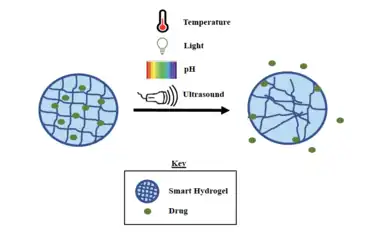 Due to the sonication capability of ultrasound and drug-release property of smart hydrogels, there has been scientific interest in controlling the release of the payload from hydrogels.[10] Focusing and directing acoustic energy (that can convert to thermal or mechanical energy[36][40]) towards smart hydrogels, implanted within tissue at times, induces a hydrogel response that results in the release of the embedded payload. Although hydrogels that are sensitive to mechanical pressure are generally used in ultrasound-triggered drug delivery platforms, hydrogels that respond to changes in temperature have also been used for these systems.[10] For example, Makhmalzadeh et al. proposed an ultrasound-triggered drug delivery method involving the use of thermo-responsive hydrogels loaded with silibinin, a cancer drug for treating melanoma.[16][41] At low temperatures, these thermo-responsive hydrogels exist in liquid form but following ultrasonication, they transition into a gel state.[16][25] Although ultrasound- and thermo-sensitive hydrogels are responsive to certain ultrasound modalities, they differ in how they respond to external stimuli. Ultrasound-responsive hydrogels are capable of being stimulated by more than one type of stimulation force through ultrasound.[42] Conversely, thermo-responsive hydrogels, as the name specifies, can only respond to the thermal forces induced by ultrasound.[13] Despite this, thermo-responsive hydrogels have been widely used in cancer-based drug delivery systems.[6]
