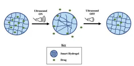 The underlying drug-releasing mechanism induced by focused ultrasound onto ultrasound-sensitive hydrogels is based on mechanical or thermal effects.[19][31][45] Mechanical-based ultrasound sonication mechanisms refer to the conversion of acoustic energy into mechanical energy with various types that include acoustic cavitation force,[31][45] or oscillation force.[36] Generally, applying mechanical pressure to a responsive hydrogel loaded with drugs causes the hydrogel to deform. This deformation reduces the structural integrity of the hydrophobic core, allowing for the release of the drug payload.[43] Both ultrasound- and thermo- responsive hydrogels are capable of carrying various embedded carriers of drug payloads which include metal-organic framework,[52] nanoparticles,[23][28] and liposomes.[53] Although many studies have demonstrated the irreversible compression of hydrogels induced under ultrasound, Goncalves et al. designed hydrogel-based nanoparticles that were capable of “self-healing”, meaning they were able to return to their original form following drug release from its depot.[28]