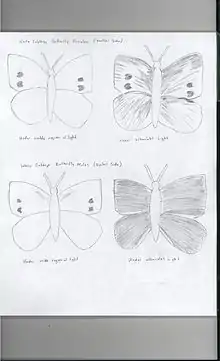 Some butterfly species use ultraviolet light as a method of signaling their sex. For example, in the species Eurema lisa, males possess the structural requirements necessary to reflect ultraviolet light discussed previously, but females lack the ultraviolet light reflecting ridges. In both sexes of this species, a flutter response, or the rapid opening and closing of the wings, is performed when a male approaches another butterfly; yet, males copulate with females who perform this behavior, while retreating from males who perform the flutter response. By showing that male and female wings are similar in appearance except for UV reflectance and an approaching male is exposed to ultraviolet reflection of a male's wings during a flutter response, as well as ruling out temporal differences in the flutter behavior as a cause for sex recognition, Ronald Rutowski concluded that ultraviolet light was being used as an indicator of the male sex.[9] However, in some species this distinction is not seen at all times, and UV patterns may vary visually depending on the position of reflecting light. This can be seen in the common brimstone, where males will exhibit male or female patterns of iridescence with different positions, distances, and angles of light - this is known as the "gynandromorphic" effect.[10]