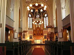 The church was destroyed in 1770 by the Russian Army and again following the Umeå city fire of 1888 which destroyed most of the town.[4] The existing new-gothic church was designed by the city architect Fredrik Olaus Lindström and built in brick with a stone foundation. The church was constructed between 1892 and 1894, and it is the third of a series of churches on the same site.