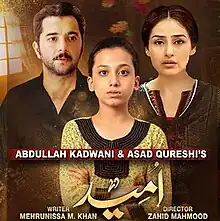 Umeed is a Pakistani social soap opera television series, produced by Abdullah Kadwani and Asad Qureshi under their production banner 7th Sky Entertainment. It features Erum Akhtar, Kashif Mehmood, Farhan Ally Agha, Sara Saif and Sidra Batool as lead along with Sajid Shah, Asim Mehmood, Afshan Qureshi, Humaira Bano, Esha Noor and Farah Nadir in pivotal roles.[1][2]