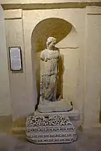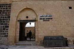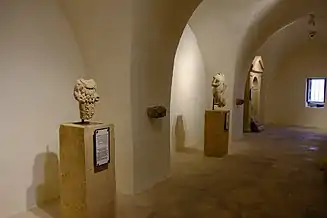 The museum has among its exhibits mosaics and coins that were found in excavations.[9] The museum contains artifacts dating from the Hellenistic to the Islamic period, among the artifacts in the museum are masks, among them is Dionysius mask made of pure white marble, also the museum has statues of gods such as Zeus, Sator and Artemis, among the statues is a statue of a snake made of yellowish white limestone, and a statue of Hermes Arbach made of white marble that is on a pedestal. The museum also contains some Egyptian statues made of limestone and basalt. In addition, the museum contains an inscription of the poet Eribuis on a tombstone made of basalt.[5] The museum also exhibits what was found in tombs from the archeological site of the city, as well as pottey collections such as small jars.[10]