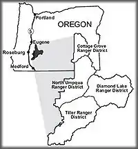 Umpqua National Forest, in southern Oregon's Cascade Range, covers an area of 983,129 acres (3,978.58 km2) in Douglas, Lane, and Jackson counties, and borders Crater Lake National Park. The four ranger districts for the forest are the Cottage Grove, Diamond Lake, North Umpqua, and Tiller ranger districts. The forest is managed by the United States Forest Service, headquartered in Roseburg.