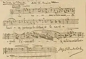 Un jardin sur l'Oronte was premiered at the Palais Garnier in Paris on 7 November 1932 with Suzanne Balguerie in the title role. It was conducted by Philippe Gaubert, with sets and costumes designed by René Piot[1] and executed by Mouveau, Solatgès and Mathieu, and a choreography by Léo Staats.