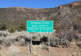 Unaweep Canyon is a geologically unique canyon that cuts across the Uncompahgre Plateau, Mesa County, in western Colorado. It is unique because two creeks, East Creek and West Creek, flow out of opposite ends of the canyon, separated by the almost imperceptible Unaweep Divide.[2] State Highway 141 runs inside Unaweep Canyon between Whitewater and Gateway, one segment of the Colorado-designated Unaweep/Tabeguache Scenic Byway.[3][4] The Unaweep Divide, elevation 7,048 ft (2,148 m), is near mile marker 135 on SH 141.[2]