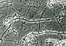 | Uncinocarpus reesii strain UAMH 160 in phase contrast microscopy showing hooked ascomatal appendage and Malbranchea anamorph | |