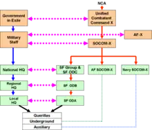 Note that dotted lines run from the underground and auxiliary to Navy and Air special operations units under the UCC Special Operations commander. These indicate that resupply might be brought in by sea or air, and the UW force will use other than the guerrilla force to receive them.[25] Indeed, the guerrillas might make a diversionary attack to draw attention from the logistics or other vulnerable operation.