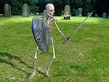 Animated human skeletons have been used as a personification of death in Western culture since the Middle Ages, a personification perhaps influenced by the valley of the dry bones in the Book of Ezekiel.[1] The Grim Reaper is often depicted as a hooded skeleton holding a scythe (and occasionally an hourglass), which has been attributed to Hans Holbein the Younger (1538).[2] Death as one of the biblical horsemen of the Apocalypse has been depicted as a skeleton riding a horse. The Triumph of Death is a 1562 painting by Pieter Bruegel the Elder depicting an army of skeletons raiding a town and slaughtering its occupants.[3]