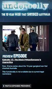 The lead-up to Underbelly involved a heavy marketing campaign which covered radio, print, billboards and an increased online presence, including the use of social networking tools.[4] At a reported cost of $500,000,[5] both this marketing investment and potentially millions of dollars in advertising revenue were claimed to be put at risk by the Victorian Supreme Court's injunction,[5] as the series was expected to attract 800,000 to 1 million viewers in Victoria alone.[6] The injunction was put in place to ensure that upcoming criminal trials were not unfair to the accused, because the series contained fictionalised re-enactments of several disputed events. Underbelly began screening on 13 February 2008 on the Nine Network in all states and territories except Victoria and some regional parts of New South Wales, Queensland, South Australia, Tasmania and the Northern Territory.[7] An edited version of the series premiered in Victoria on 14 September 2008 after the injunction was partially lifted, although only the first five episodes were shown.[8] In 2011, the injunction was partially lifted and the series was screened as "Underbelly: Uncut". This rebroadcast included scenes from the original DVD release, as well as several significant changes that were made to keep the show current, including a newly recorded final voiceover and the crediting of several characters that were previously uncredited (allowable due to the ending of related trials). Some previously named characters in the final episode however are now unable to be named, resulting in a continued banning of the sale of the video release in Victoria.