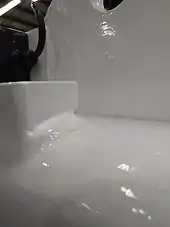 In welding, undercutting is when the weld reduces the cross-sectional thickness of the base metal. This type of defect reduces the strength of the weld and workpieces. One reason for this defect is excessive current, causing the edges of the joint to melt and drain into the weld; this leaves a drain-like impression along the length of the weld. Another reason is if a poor technique is used that does not deposit enough filler metal along the edges of the weld. A third reason is using an incorrect filler metal, because it will create greater temperature gradients between the center of the weld and the edges. Other causes include too small of an electrode angle, a dampened electrode, excessive arc length, and slow speed.[1]