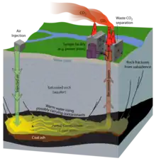2 on-site into the highly permeable rock created during the burning process, i.e. the cavity where the coal used to be.[34] Contaminants, such as ammonia and hydrogen sulfide, can be removed from product gas at a relatively low cost.