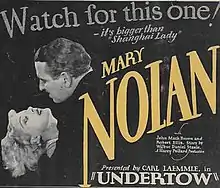 Undertow is a 1930 American drama film directed by Harry A. Pollard, written by Edward T. Lowe, Jr. and Winnifred Reeve, and starring Mary Nolan, Johnny Mack Brown, Robert Ellis, Churchill Ross and Audrey Ferris. It was released in March 1930, by Universal Pictures.[1][2][3]