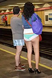 Society often portrays the public in underwear as surrealist and comedic: No Pants Day is an annual event held in various Western countries, where people publicly wear only underwear and leave their legs exposed. No Pants Subway Ride is a similar event to promote public wearing of underwear on subway trains. Another such event is Undie Run, where people run on the street wearing only their underwear.