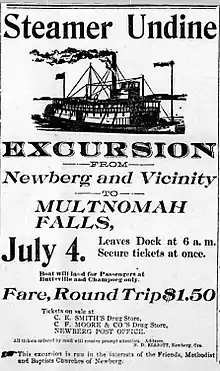 - "The excursion from Newberg that went up the Columbia on the steamer Undine …", Oregon City Enterprise, Oregon City, OR: Chas. Meserve, vol. 25, no. 1, 5, col.4, June 26, 1891