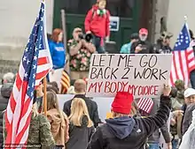 The effects of gender hierarchies were exacerbated during the height of COVID-19.[81] Women's unemployment was impacted more than men's, which is not the case during typical recessions.[77] Mothers were likely to suffer from unemployment for several reasons, including daycare closures, household structures, and job flexibility based on gender.[77] Among married couples, women are more likely to provide childcare than men even when they both work full time.[77] This means that daycare closures disproportionately affected mothers because they were more likely to be expected to take care of their children. While most parents struggled, single mothers were most negatively impacted, partly because single-mother households make up 21% of all households in the United States as compared to only 4% of single-father households.[77] Additionally, mothers were more affected than fathers because men are more likely to have flexible jobs, which allowed them to telecommute. 28% of men work in jobs where they are able to telecommute often, but only 22% of women work in these jobs.[77] Women were at greater risk of contracting COVID-19 in critical (or essential) job positions and more likely to be let go because their work was less flexible.[77]