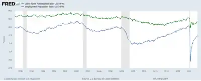 - Analysts can adjust for the effect of demographics by examining the ratio for those "prime-working aged" persons aged 25–54. For this group, LFPR fell from 83.3% in November 2007 to a trough of 80.5% in July 2015, before partially recovering to 81.8% in October 2017. The EM ratio for this group fell from its November 2007 level of 79.7% to a trough of 74.8% in December 2009, before recovering steadily towards 78.8% in October 2017. In both cases, the ratios had yet to reach their pre-crisis peaks, a possible indicator of "slack" in the labor market with some working-age persons on the sidelines.[55][56]