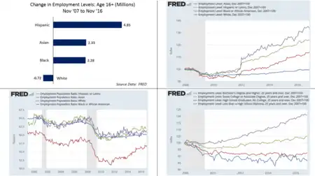 - Whites saw their employment levels fall more than non-whites over the 2007–2016 period, as a relatively larger number of white persons moved out of the prime working age (25–54) and into retirement. The number of white workers fell by approximately 700,000 from November 2007 (pre-crisis) to November 2016, while the number of workers of other races rose. Hispanics added approximately 4.9 million (+24%), Asian 2.3 million (+34%), and African Americans 2.3 million (+14%).[102] These racial disparities may have helped the Trump campaign with the white working class voters in 2016.[103] While the age 25–54 white population fell about 5% from November 2007 to November 2016, which would correspond with a declining number of whites employed, whites also had a larger decline in the employment to population ratio than non-whites.[83]