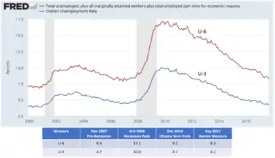 - The unemployment rate (U-6) is a wider measure of unemployment, which treats additional workers as unemployed (e.g., those employed part-time for economic reasons and certain "marginally attached" workers outside the labor force, who have looked for a job within the last year, but not within the last 4 weeks). The U-6 rate rose from 8.8% in December 2007 to a peak of 17.1% in November 2009, before steadily falling to 9.2% in December 2016 and 7.6% in December 2018.[41]