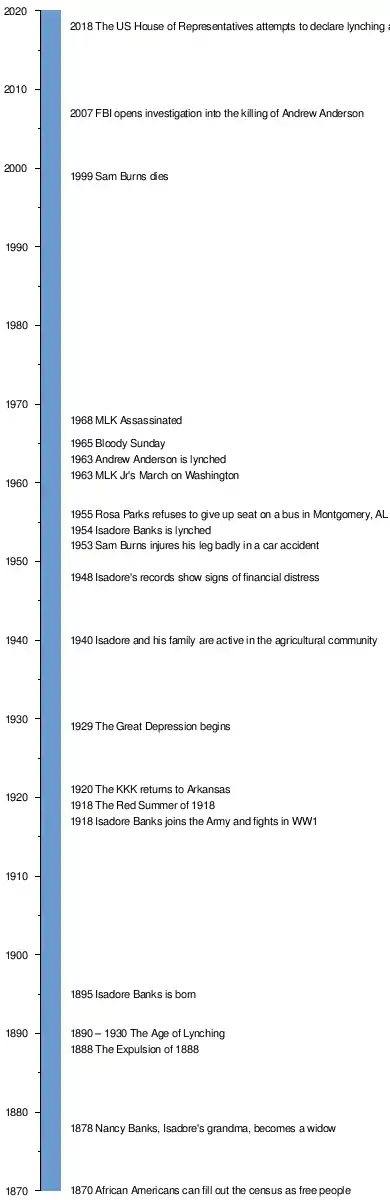 | Taylor and Neil investigate the details of Isadore Banks' life through interviews that recount the violent encounters leading up to his death. Relatives sprawled throughout the country piece together the Banks' family lineage and provide a racialized historical context of Arkansas. Nancy Banks, Isadore's grandmother, began what Isadore would later build into his wealth by buying land in Georgia in the name of her kids. The Banks family migrated to Arkansas, the state most migrated to between the end of the Civil War and 1920. Isadore's fortune constantly ebbed and flowed in the decades after their arrival. | |||