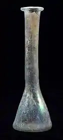 An unguentarium (plural "unguentaria"), also referred to as Balsamarium (plural "Balsamarii"), Lacrimarium (plural "Lacrimarii") or tears vessel,[1] is a small ceramic or glass bottle found frequently by archaeologists at Hellenistic and Roman sites, especially in cemeteries.[2] Its most common use was probably as a container for oil, though it is also suited for storing and dispensing liquid and powdered substances. Some finds date into the early Christian era.[3] From the 2nd to the 6th century they are more often made of blown glass rather than clay.[4] A few examples are silver or alabaster.[5]