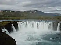 The season began filming in July 2019 with six days on location in Iceland.[19][76] The country was chosen because the producers wanted to introduce the future of Star Trek with a place that looked different to the previous seasons, and because Kurtzman had always wanted to film there.[19] Originally, the first two episodes of the season were to be directed by producing director Olatunde Osunsanmi and frequent Star Trek director Jonathan Frakes, respectively, but both episodes required location filming in Iceland. Osunsanmi ultimately directed both, beginning with a combined Iceland shoot, with Frakes then directing the third episode.[31] Glen Keenan returned from the second season as the lead director of photography for the third,[77][78] including serving as the cinematographer for the first two episodes.[31] Filming locations in Iceland included the Hverfell volcano, Goðafoss waterfall, Lake Kleifarvatn, and the Blue Lagoon. The series took advantage of the Icelandic Film Commission's payback program, which reimburses 25 percent of the production costs spent in the country, receiving around US$421,480.[79][80]