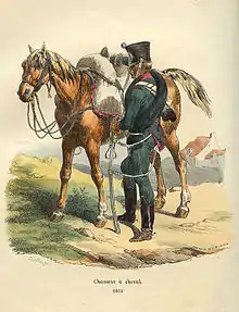 After 1804: The cahouk became red with a brass crescent and star, and the shirt was closed and had a collar. The main change was the addition of a "regulation" chasseur-style saddle cloth and roll, imperial green in color, piped red, with a red and white fringe. The saddle and harness remained Arabic in style. The undress uniform was as for the Chasseurs-à-Cheval of the Guard, but of a dark blue cloth.
