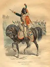 The Dragoon Guards wore green coats with white lapels and red turnbacks. They also wore aurore (light orange) aiguillettes and epaulettes. They wore brass helmets with a long black mane, a simulated leopard fur turban and a red plume (white plume for the highest officers). They rode chestnut horses.