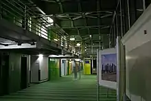 The hospital's exterior has extensive visible pipes, which give the building an industrial appearance reminiscent of an oil refinery.