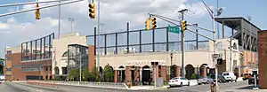 The site on which Union City High School sits was acquired by the city in the 1930s, having originally been the location of the Hudson County Consumers Brewery Company, which opened in 1901 and closed in 1928.[21] Through the efforts of Director of Public Affairs Harry J. Thorout and the Federal Works Progress Administration, which awarded the project $172,472, as part of Franklin D. Roosevelt's New Deal, it was turned into the art deco Roosevelt Stadium, which opened in 1937.[22] Though primarily a football stadium that served as a home to future National Football League greats Lou Cordileone and Frank Winters and College Football Hall of Famer Ed Franco, the stadium also housed events in semi-pro baseball, soccer, track, boxing, as well as numerous special events, such as an exhibition baseball game featuring Babe Ruth and Lou Gehrig.[23] Roosevelt Stadium was also the home to the annual Thanksgiving Turkey Game between rivals Emerson High School and Union Hill High School, the two high schools that previously served the city. The last Turkey Game was hosted by the stadium in 2004.[22] Three subsequent Turkey Games were held at the Midtown Athletic Complex until 2007, after which the two high schools would be converted into middle schools.[7] José Martí Middle School, which is located on Summit Avenue at 18th Street, was converted into José Martí Freshman Academy.