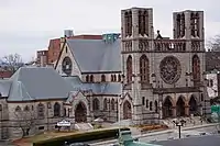 The Union Congregational Church or Chestnut Street Congregational Church is a historic Congregational church building at 5 Chestnut Street in Worcester, Massachusetts. The church is a well-preserved local example of Victorian Gothic Revival styling. Its basic appearance is reminiscent of the Notre Dame de Paris, although on a more modest scale. The building was designed by Earle & Fisher and construction took place between 1895 and 1897. Its main facade features twin towers flanking an entrance consisting of three trefoil arches, above which is a large rose window and an arched arcade connecting the two towers. The upper levels of the towers are open areas surrounded by paired narrow pointed-arch openings, and are decorated by crenellations and gargoyles. The main body of the church is covered in a slate roof (original replaced in 1948), and the stained glass of some of its windows was brought over from the buildings of other church congregations which merged into the Union congregation.[2]