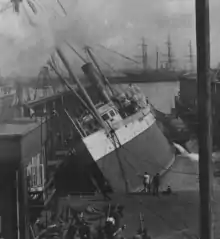 At the time of the 1906 San Francisco earthquake, the coastal passenger liner Columbia of the San Francisco and Portland Steamship Company had been undergoing a refit at the yard's hydraulic drydock. The earthquake caused the iron-hulled Columbia to shift off her supports and roll onto the drydock on her starboard side. This damaged the drydock, a key feature of the yard, beyond economic repair. Columbia on the other hand, despite being partially flooded and damaged, was repaired and returned to service in January 1907.[7][8] In 1908, Bethlehem Shipbuilding Corporation bought the Hunter's Point drydocks. In the pre-World War I era, Union Iron Works built several navy ships that became internationally famous due to the Spanish–American War including Commodore Dewey's flagship the Olympia. After 1905, the shipyard operated as part of Bethlehem Steel, and produced both warships and merchant ships. The shipyard was expanded in 1911 by purchasing Risdon Iron Works, the land next to the shipyard. Risdon Iron Works built locomotives, this was closed and a new shipyard was built to build US Navy including destroyers and submarines. Risdon Iron Works was founded by John Risdon of Saline, Michigan in 1896. Risdon Iron Works started by building boilers, iron pipes, steam engines and gas engines. From 1873 to 1909 Risdon Iron Works also built ships, tugs, ferries and barges. John Risdon held the patents for the first river mining dredge.[9][10]