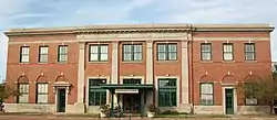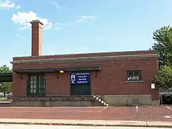 The station is a two-story, Georgian Revival, tan brick building.[4] It is built on a concrete foundation. The building features a stylized Greek temple front on the north and south elevations, which emphasizes the building's entrances. The temple features four columns that are attached to the building with tapered, square shafts and stylized capitals. The columns support a Classical entablature that includes dentils, round medallions, and stepped fascia. A heavy cornice crowns the perimeter of the building. The building features rectangular windows on both floors, but the first-floor windows are framed with arches. Keystones made of concrete highlight the windows. Deep awnings are above the primary entrances.