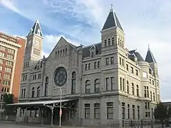 The Union Station of Louisville, Kentucky is a historic railroad station that serves as offices for the Transit Authority of River City (TARC), as it has since mid-April 1980 after receiving a year-long restoration costing approximately $2 million. It was one of at least five union stations in Kentucky, amongst others located in Lexington, Covington, Paducah and Owensboro. It was one of three stations serving Louisville, the others being Central Station and Southern Railway Station. It superseded previous, smaller, railroad depots located in Louisville, most notably one located at Tenth and Maple in 1868-1869, and another L&N station built in 1858. The station was formally opened on September 7, 1891 by the Louisville and Nashville Railroad. There was a claim made at the time that it was the largest railroad station in the Southern United States, covering forty acres (16 ha).[2] The other major station in Louisville was Central Station, serving the Baltimore and Ohio, the Illinois Central and other railroads.