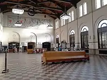 This original depot location proved not to be very well-suited for a passenger rail hub. Local newspapers complained about, among other things, the need to walk a quarter-mile of wood boardwalk over swampy ground to reach the station. So the Union Pacific and Central Pacific launched a jointly-owned terminal railroad company, the Ogden Union Railway & Depot Co. (OUR&D), to oversee the construction and operation of a new Union Station.[4] Completed in 1889, this new structure was designed in the Romanesque Revival style, with a large clock tower in the center. Considerably larger than the original station and constructed of brick, it held 33 hotel rooms, a restaurant, barbershop, and other conveniences for travelers. In 1923, a fire that began in a hotel room destroyed the station's interior and left the walls and clock tower in a fragile state. No deaths or injuries were reported, and work continued inside the first floor to some extent, but construction on a new building did not start until a stone from the clock tower fell and struck a railroad clerk, killing him instantly. Originally, the OUR&D planned to rebuild the station to its original design, but the accident reversed this decision and a new design was proposed by John and Donald Parkinson, architects of the Caliente Depot in Nevada and the Kelso Depot in California.[6] The construction of the current building was completed in 1924 in the Spanish Colonial Revival (also known as Early Christian/Byzantine) style and is built on the foundation of the earlier building.[7] It was dedicated on November 22 of that year, with a series of publicity shots being taken. One of these shots, showing 13 young women pulling the first train to arrive at the station by ribbons, made its way into the La Domenica del Corriere, an Italian newspaper, with the headline "Curious American Custom".[8] The ceiling of the Grand Lobby, taking up the center portion of the building, has a height of 56 feet and extends to the roof. The trusses were originally painted in bright colors with geometric designs, but have since been painted over with a faux wood grain. Murals of the construction of the Transcontinental Railroad were painted on the north and south end of the lobby. The second floors of the north and south wing were occupied by Southern Pacific (which had purchased the Central Pacific in 1885), Ogden Union Railway & Depot Co., and Union Pacific Telegraph Department offices.[6]