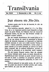The union of Transylvania with Romania was declared on 1 December [O.S. 18 November] 1918 by the assembly of the delegates of ethnic Romanians held in Alba Iulia. The Great Union Day (also called Unification Day[1]), celebrated on 1 December, is a national holiday in Romania that celebrates this event. The holiday was established after the Romanian Revolution, and celebrates the unification not only of Transylvania, but also of Bessarabia and Bukovina and parts of Banat, Crișana and Maramureș with the Romanian Kingdom. Bessarabia and Bukovina had joined with the Kingdom of Romania earlier in 1918.