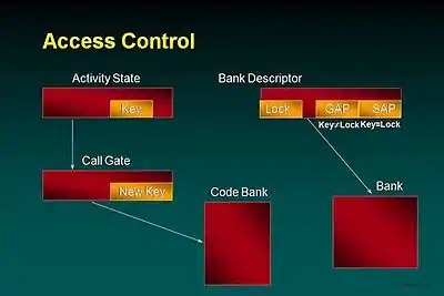 The BD also contains a key value and access control fields. The fields indicate whether read, write, or execute permission is granted to the instruction processor (3 bits). The Special Access Permissions (SAP) applies only to activities executing within the owning subsystem (really only those with a matching key value). The General Access Permissions (GAP) applies to everyone else and is usually zero (no access). The Exec sets a key value in the state of each activity which may be changed by gate and interrupt transitions.