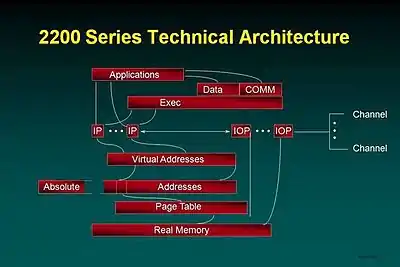 All I/O on 2200 Series systems is handled by I/O processors. These processors offload large portions of the I/O path length and recovery, and by fully isolating the main system from I/O faults, interrupts, bus errors, etc. greatly improve reliability and availability. The I/O processors come in three different types (Storage, Communications, Clustering) but the only real difference is the firmware load.[4]