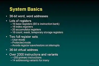 Basic mode is another whole form of instruction formats and addressing. Basic mode provides compatibility with previous systems back to the 1108. For all practical purposes, the hardware architecture defines the rules by which addresses and instructions are converted to the above forms. The most obvious difference in basic mode is the lack of explicit B registers in instructions. Instead there are four implicitly used B registers (B12-B15). There is a complex algorithm using the limits of the banks represented by those B registers, the operand address and the B register within which the current instruction is found.