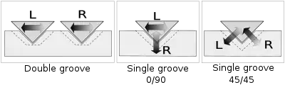 Patent 394325 put forward a third proposition: the single cutter should be driven by two orthogonal actuators, placed at 45° and −45° to the surface of the disc.[53] Polarities of electrical L and R signals that drive the actuators must be chosen in such a way that the lateral movement of the cutter corresponds to monaural signal M, and vertical movement corresponds to the difference between two stereo channels, S.[53] This ensures backward compatibility with traditional monaural pick-ups of the most common, lateral-cut system.[53]