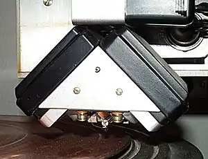 The developments at Decca forced EMI to speed up their half-hearted effort.[91] The management believed that stereo recording technology was still unreliable, and refrained from rushing stereo records into production.[33] Instead, in 1957 the company released an expensive intermediate format – prerecorded Stereosonic magnetic tapes.[89][33][92] The proprietary recording technique was developed by Blumlein's former colleagues Vanderlyn, Clark and Dutton, and relied on the use of XY Blumlein pairs and Blumlein shufflers that introduced crosstalk at frequencies above 700 Hz.[89][33][92][93] Shuffling was intended to equalize high-frequency and low-frequency sound localization, however, it was a poor match to practical studio environment at Abbey Road.[94] The tapes were too expensive for the consumer market and were soon discontinued.[92]