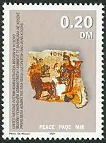 Kosovo had operated its own postal service within the Socialist Federal Republic of Yugoslavia since 1959. At that time Yugoslav postage stamps were in use. After Kosovo came under United Nations administration, UNMIK became responsible for issuing postage stamps for Kosovo. The first UNMIK issued stamps were released on 15 March 2002 based on the theme of "peace".[40][41] Further sets were issued by UNMIK up until Kosovo unilaterally declared independence after which stamps were issued in the name of the Republic of Kosovo.[42]