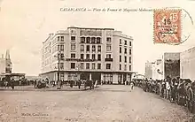 The Magasins Paris-Maroc building (1914), constructed by Hippolyte Delaporte and Auguste Perret, was located at the southern end of Place de France.[1][2] in 1915, Hubert Lyautey inaugurated the new Casablanca branch of the State Bank of Morocco was inaugurated on the square's northeastern side.[3][4] The Neo-Mauresque Hotel Excelsior, which remains today, was built in 1916.[5]