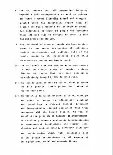 "The USC shall formulate national policies, strategy and plans of action to effectively establish and consolidate a Federal Central Government and a democratically elected parliament that truly represents all the Somali citizen. As well as establish the principle of regional self government. This will help create a systematic decentralisation of governmental institutions and support local planning and decision-making, community initiative and participation which will eventually lead to the people self-reliance in all aspects of their political, social and economic lives"