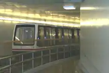 On the Senate side, two separate subway lines exist. The first is a crewed two-track system, with a single open-topped car operating on each track, connecting the Russell Senate Office Building and the Capitol. The other is a computer-controlled system with three enclosed trains of three cars each running on a 90-second schedule, connecting the Hart Senate Office Building, the Dirksen Senate Office Building, and the Capitol.[5] The train cars are unpowered; the train is propelled by a track-side linear motor. This line has two parallel tracks for most of its length, but at the Hart and Capitol stations the tracks converge into one, with a single side platform. This allows easy return travel on the opposite track. The Dirksen station features a side platform for Capitol-bound trains and an island platform for Hart-bound trains. All three of these stations feature platform screen doors. A small maintenance spur is located adjacent to the Hart station.