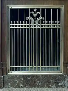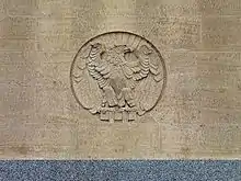 The main entry is in the north elevation, which is the most elaborate. The entablature above the third story windows projects slightly from the vertical surface of the building, set off by a limestone stringcourse. A decorative parapet at the top of the building features a carved limestone frieze with a stylized Ionic order capital and shield design. The elevation is nine bays wide. The second and eighth bays feature ground floor entrance doors, each with dark gray granite surrounds. Immediately above the doors are circular limestone panels featuring stylized carved eagles. Pairs of bronze light stanchions with granite bases flank each door, each with an embossed chevron and geometric designs. The door surrounds feature stylized carvings that imitate Beaux-Arts style classical pilasters. Embossed bronze spandrels separate the second and third story windows.[5]