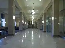 The most significant interior space is the two-story courtroom that occupies the central portion of the second floor, and its adjacent judges' chambers, library, and restroom. Flat geometric patterns and chevron designs reflect the architectural details of the building's exterior, as do the fluted classical pilasters. The interior of the east doors, which provide the main entry to the courtroom, are covered with leather and trimmed with metal studs. A base of rouge marble rings the room. The laurel paneling is laid in a herringbone pattern. The wood grain of the wainscoting is vertically oriented. The cornice frieze, carved to depict chevrons and stylized leaves, is black walnut. Black walnut insets depicting leaves and berries are located above the doors on the west side of the room. Some of the furnishings are original. Additional original interior details that remain include the flooring, some of which are terrazzo floors and others are marble. The wainscoting, cladding in bathrooms and vestibules, door surrounds in the vestibules and the first floor elevator lobby, stairway treads, and hallway baseboards are original marble. Some lighting fixtures in the stairwells and hallways are also original.[5]