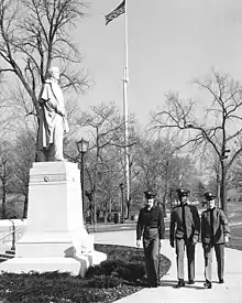 The academy grounds are home to numerous monuments and statues. The central cadet parade ground, the Plain, hosts the largest number, and includes the Washington Monument, Thayer Monument, Eisenhower Monument, MacArthur Monument, Kosciuszko Monument, and Sedgwick Monument. Patton Monument was first dedicated in front of the cadet library in 1950,[108] but in 2004 it was placed in storage to make room for the construction of Jefferson Hall. With the completion of Jefferson Hall, Patton's statue was relocated and unveiled at a temporary location on 15 May 2009, where it will remain until the completion of the renovation of the old cadet library and Bartlett Hall.[109] There is also a statue commemorating brotherhood and friendship from the École Polytechnique in the cadet central area just outside Nininger Hall. The remaining campus area is home to 27 other monuments and memorials.[110]
