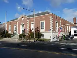 The US Post Office—Somerville Main is a historic post office at 237 Washington Street in Union Square, Somerville, Massachusetts. The 2+1⁄2-story building was constructed in 1935-36 as part of a Public Works Administration initiative during the Great Depression. The building has a steel frame, and is clad in brick laid in Flemish bond, with limestone trim elements, and topped by a truncated hip roof. It is five bays wide, with a slightly projecting central section that is topped by a gable. The main entry, slightly recessed in this section, consists of a pair of modern glass-and-aluminum doors topped by an extended round-arch fanlight window. There is a small oriel window in the gable section.[2]
